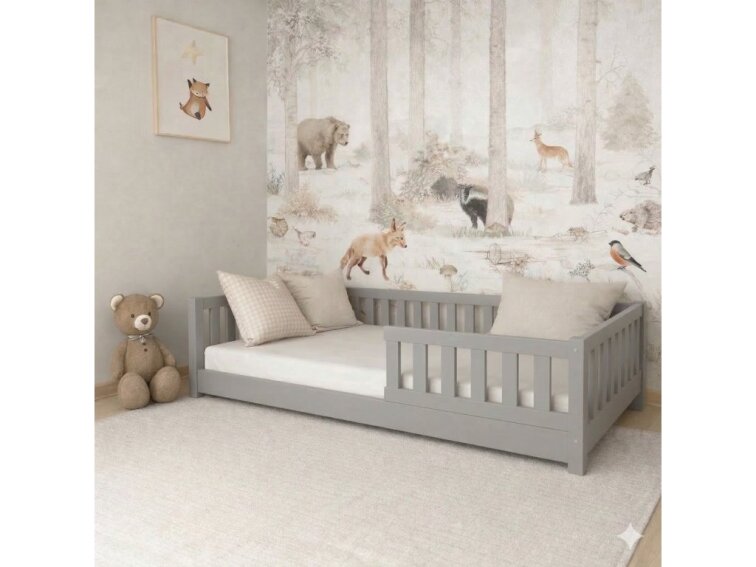 Dětská Montessori postel MONTY 120x200 v šedé barvě z borovicového dřeva. Nízká, bezpečná a stabilní konstrukce podporuje samostatnost dítěte. Součástí balení rám zdarma, snadná montáž.