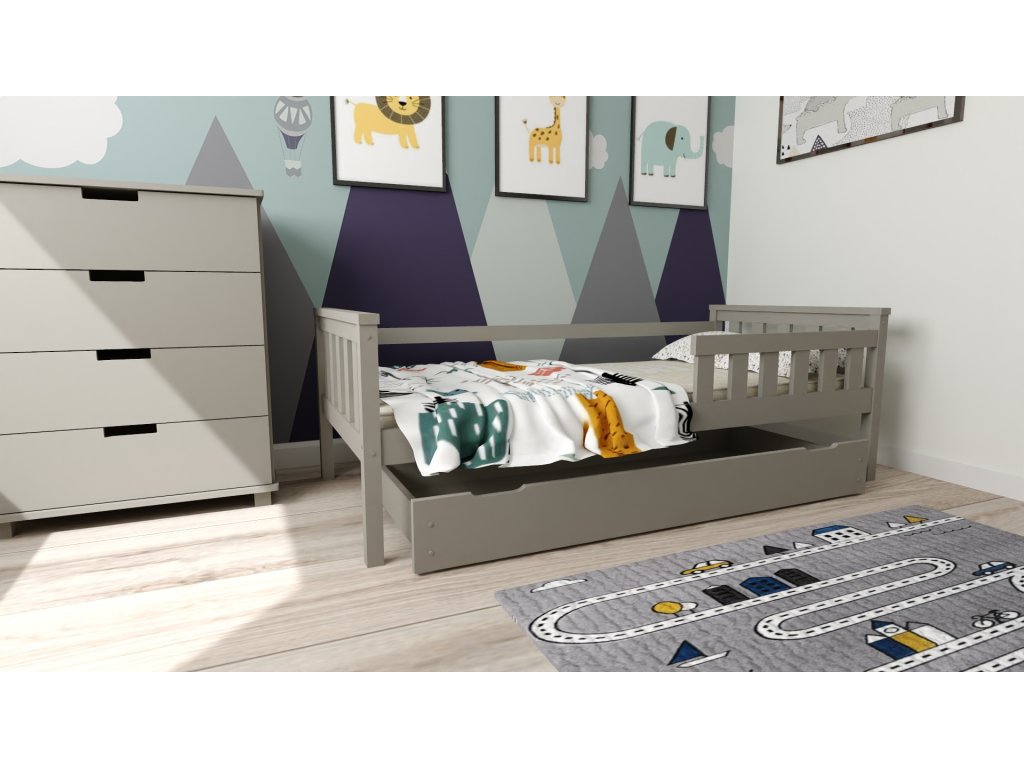Šedá postel MIKE spojuje moderní design, funkčnost a kvalitu. Je vyrobena z masivního borovicového dřeva a natřena ekologickým šedým lakem. Součástí balení je lamelový rošt (12 lišt) a šuplík z masivu s MDF dnem, který poskytuje cenný úložný prostor pod postelí. Ideální volba pro každý moderní dětský pokoj.
