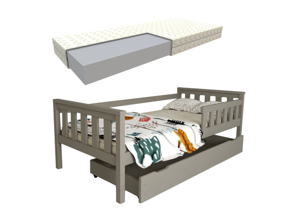 Dětská postel z masivu Mike 80x180 cm Šedá + šuplík + pěnová matrace